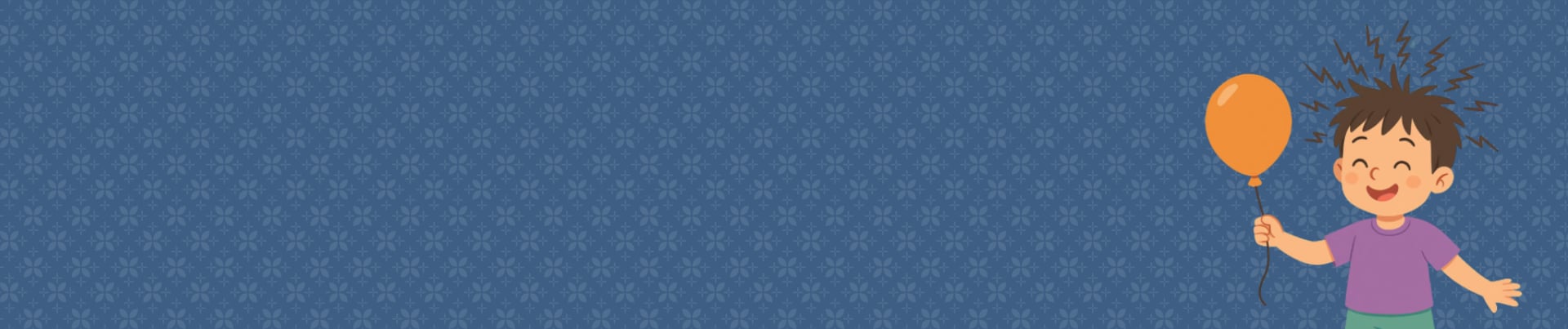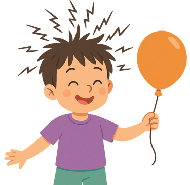 Dua benda digesekkan → elektron berpindah → salah satu kelebihan elektron (negatif), yang lain kekurangan (positif). Contoh: balon digosok ke rambut → rambut berdiri.